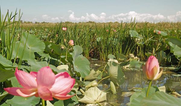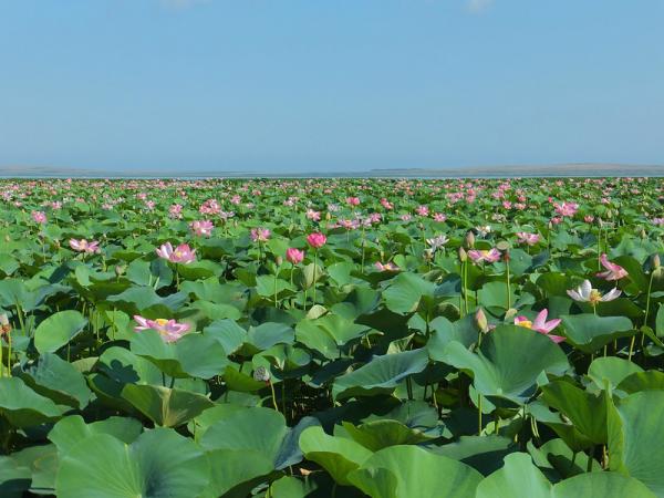 - Астраханский заповедник в дельте Волги располагается на площади 5000 гектаров. Лотос здесь цветет с июля по август и имеет крупные лепестки розового цвета. Высота растений может достигать 2 метров, а диаметр листьев — до 1,4 метра.